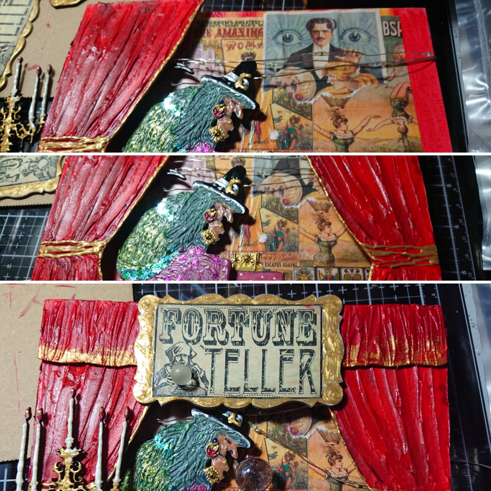 Once Maud and the curtains were glued in place I added lots of other details including a beautiful candelabra, sign, crystal ball and curtain pelmet, made in the same way as the curtains. The crystal ball was a pretty marble gifted to me by my friend Debbie. Thank you Debbie it makes a perfect crystal ball!